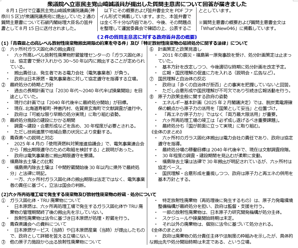 ◆2件の質問主意書への答弁書全文(PDF)