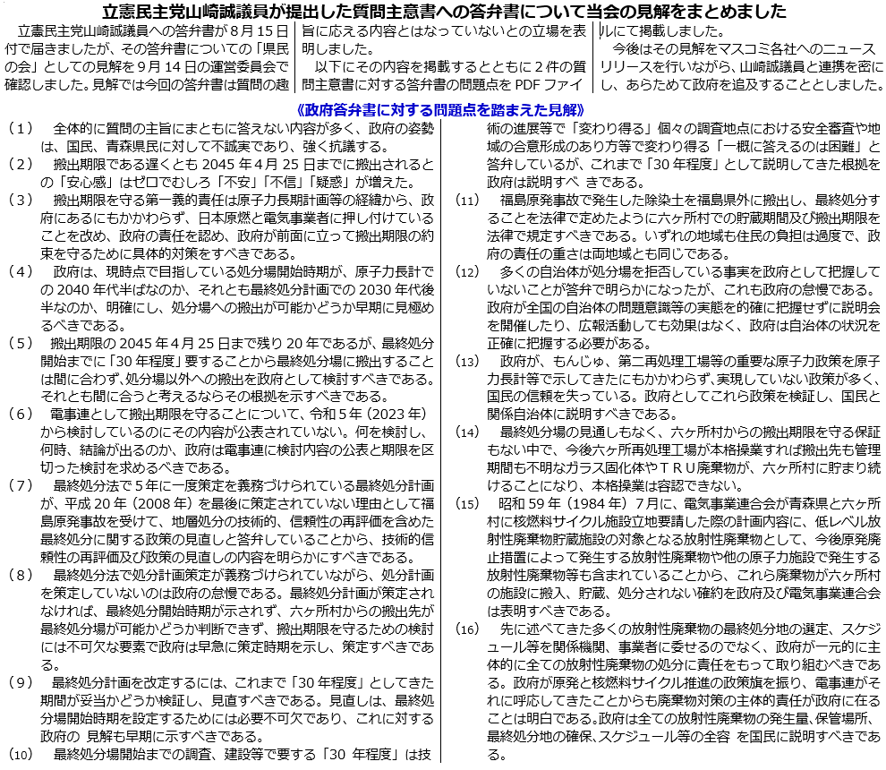 @ 「青森県との高レベル放射性廃棄物搬出期限の約束を守る件」「特定放射性廃棄物の最終処分に関する法律」に関する質問主意書に対する答弁書の問題点⇒